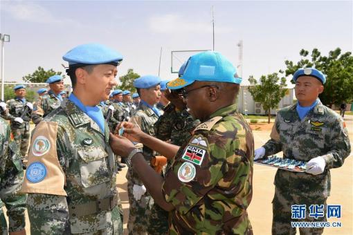 7月15日,在蘇丹達(dá)爾富爾法希爾,聯(lián)合國和非洲聯(lián)盟駐達(dá)爾富爾聯(lián)合特派團(tuán)(聯(lián)非達(dá)團(tuán))部隊司令恩貢迪中將(右二)把勛章佩戴在中國維和官兵胸前。中國首支維和直……