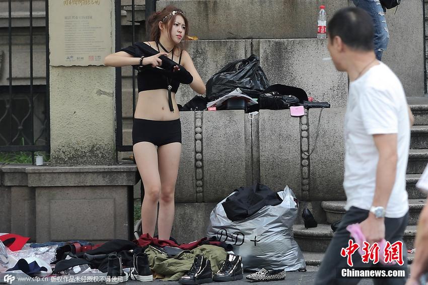 2015年9月4日,杭州中山中路一幢西式建筑外,幾名模特在街頭為網(wǎng)店拍攝秋冬服裝新品,為節(jié)省換裝時間,模特們淡定當街脫掉衣服,只剩內(nèi)衣內(nèi)褲,迅速換上另一套服……