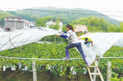臺(tái)風(fēng)“蘇迪羅”造成福安多個(gè)鄉(xiāng)鎮(zhèn)的葡萄園進(jìn)水、大棚損壞。圖為連日來,松羅鄉(xiāng)尤沃村果農(nóng)加緊搶修葡萄園避雨大棚。何小麗 鄭祖輝 攝“蘇迪羅”卷走!