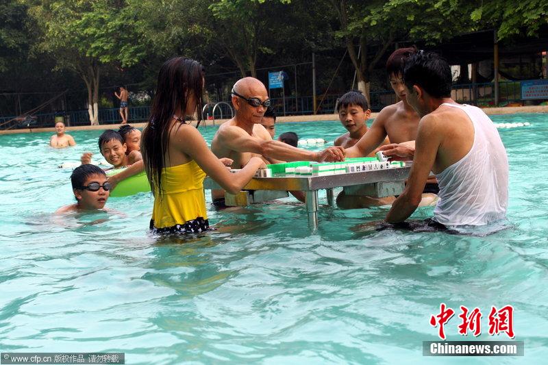 6月16日,廣東佛山。這幾天,廣東氣溫驟升,酷暑來(lái)臨,市民紛紛走出家門消暑。幾名游客竟然在游泳池里擺起了麻將臺(tái),坐在水里搓麻將,既可娛樂(lè),又可消暑,可謂是……