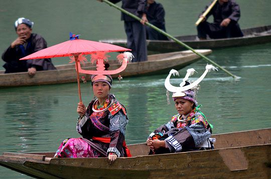圖為船頭撐傘的苗族新娘。中新社發(fā) 趙剛 攝貴州省黔南布依族苗族自治州三都縣打魚鄉(xiāng)苗族村寨來術(shù)村一直奉行著古老的“水上送親”婚俗,每當舉行“水上送親、……