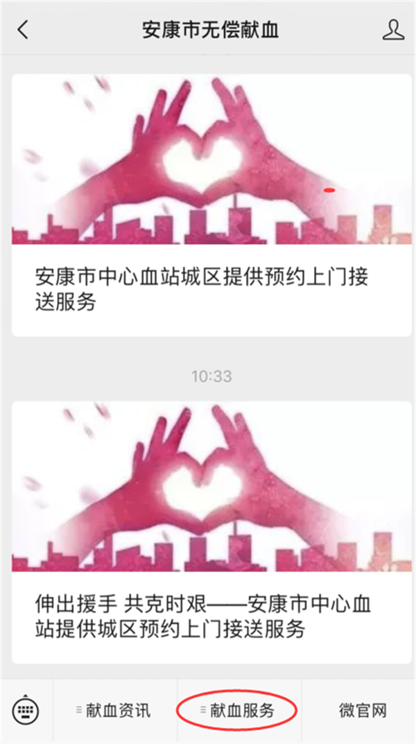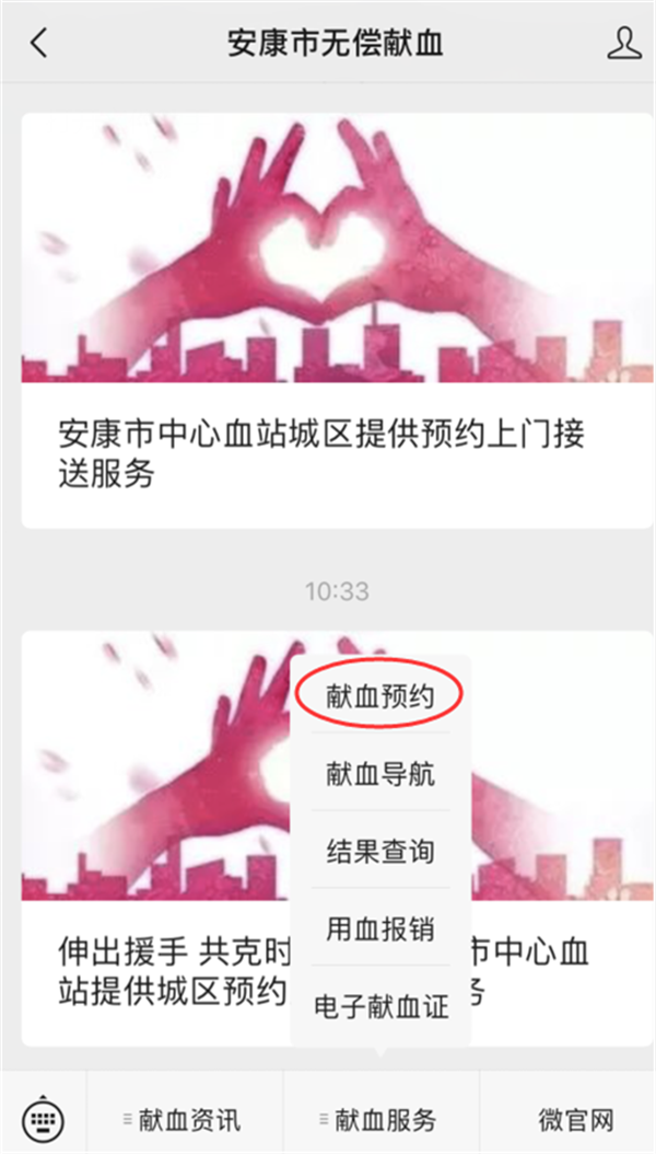 同時安康市中心血站公眾號開放獻血預(yù)約渠道,(如圖示)在關(guān)注安康市無償獻血公眾號后,在最下方菜單欄選擇“獻血服務(wù)”——“獻血預(yù)約”——填寫相關(guān)信息,便可完成預(yù)約。