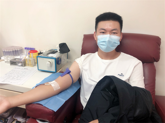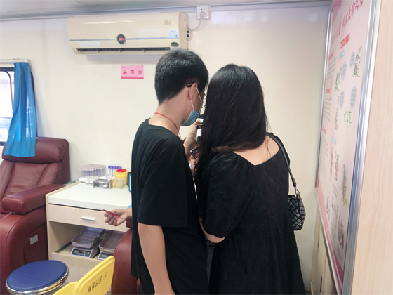 中秋節(jié)不僅街上熱鬧,獻血車上也熱鬧,鄧孟杰正坐在采血椅上獻血,他漂亮大方的女友站在旁邊跟他聊著晚上要吃什么,女友的弟弟坐在遠(yuǎn)一點的地方玩著手機,女友的媽媽則坐在體檢桌前測量血壓,“一人獻血,三人陪同”的場景著實有點可愛,但鄧孟杰笑得十分開心,一直想獻血的他特別選了中秋這個日子,大概也是想和愛人親人一起分享這種美妙的人生體驗。鄧孟杰的女友拿起他的獻血證撒嬌到:“這次我們陪你,下次你也要陪我來獻血。”說完把手機塞給了一旁的弟弟,指揮他給自己和男友拍合照,一邊打趣弟弟拍照技術(shù)不好一邊把男友手里獻血證的位置調(diào)了又調(diào)。