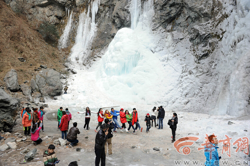 昨日下午2時(shí),游客在戶縣澇峪黑山瀑布前合影留念。不時(shí)有冰塊從瀑布上方掉落,著實(shí)讓人捏了一把汗 記者 趙彬 攝