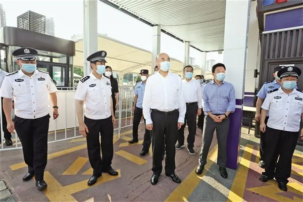 7月9日,省委書記劉國(guó)中到西安市調(diào)研檢查重點(diǎn)行業(yè)運(yùn)行保障工作并看望高溫下的一線工作人員。圖為在西安繞城高速公路曲江出口檢查站,劉國(guó)中看望執(zhí)勤民警和疫情防控工作人員。記者 張辰攝