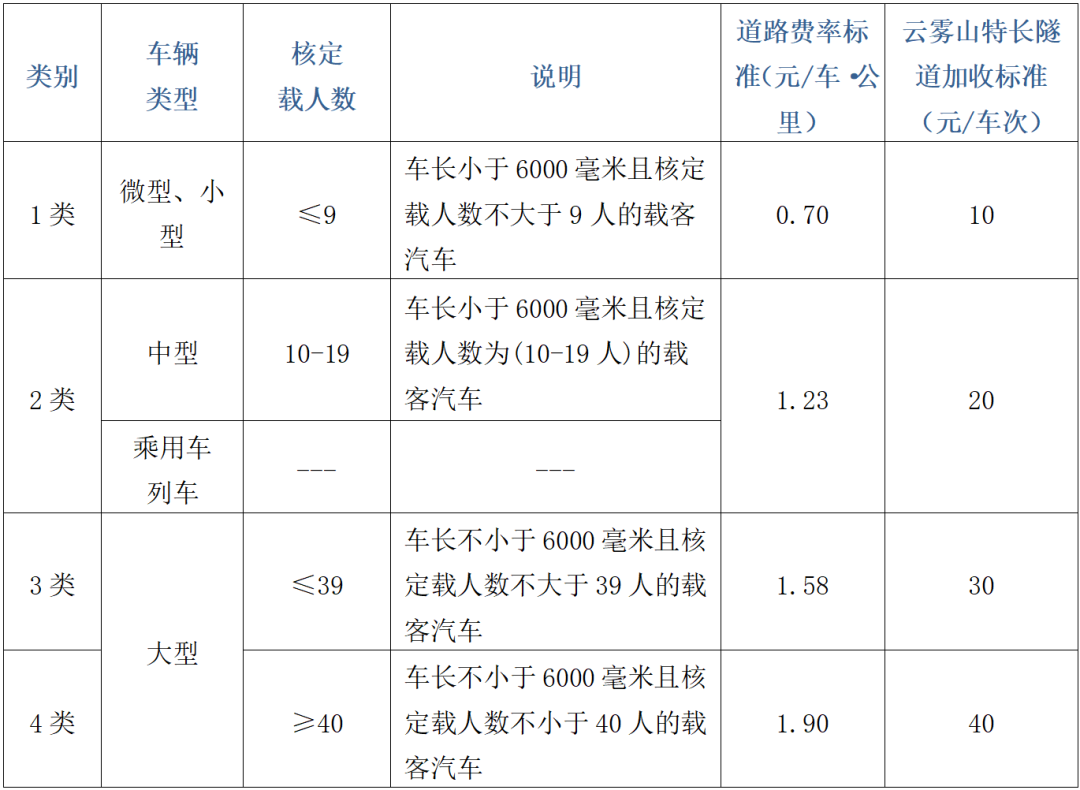 除國家規(guī)定免繳通行費的車輛外,其他車輛均須按照《收費公路車輛通行費車型分類》(JT/T489-2019)及下列收費標(biāo)準(zhǔn)繳納車輛通行費。