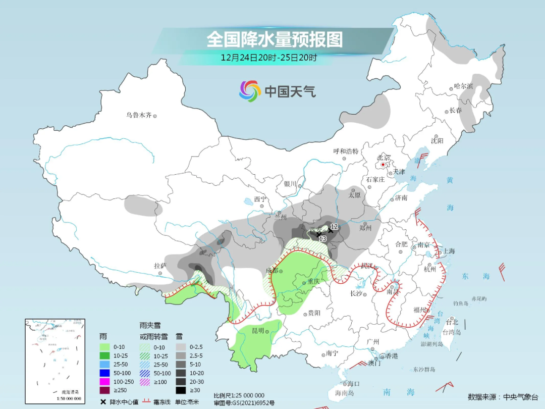 從24日夜間開始,西部地區(qū)的雨雪也將發(fā)展起來。中央氣象臺(tái)預(yù)計(jì),24日夜間至25日,青藏高原東部、西北地區(qū)東部、華北西南部、黃淮西部、湖北西部、四川西部和北部等地有小到中雪或雨夾雪,局地大到暴雪。