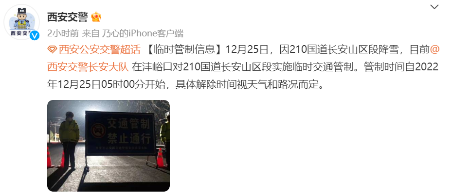 12月25日,因210國道長安山區(qū)段降雪,目前西安交警長安大隊(duì)在灃峪口對(duì)210國道長安山區(qū)段實(shí)施臨時(shí)交通管制。管制時(shí)間自2022年12月25日05時(shí)00分開始,具體解除時(shí)間視天氣和路況而定。