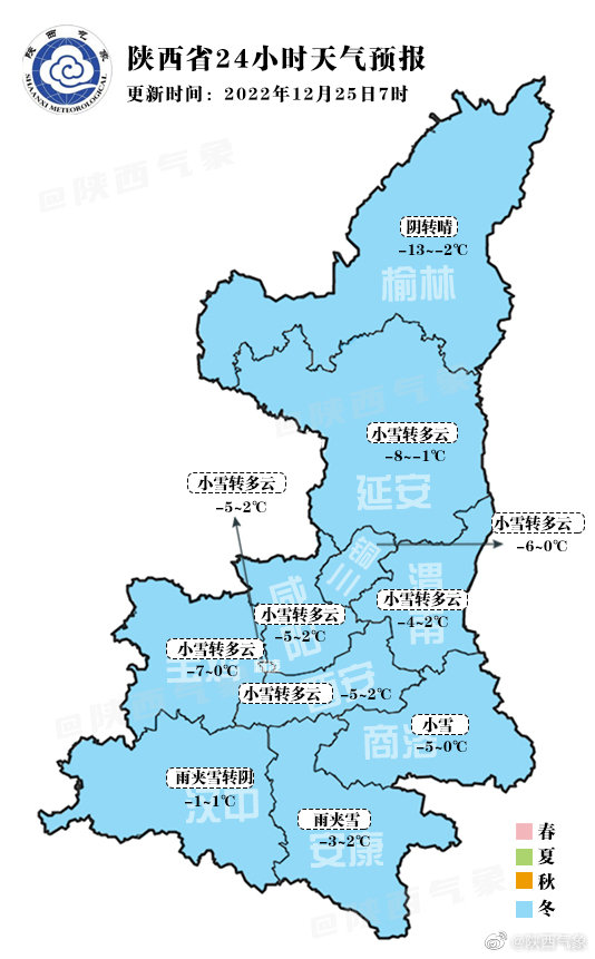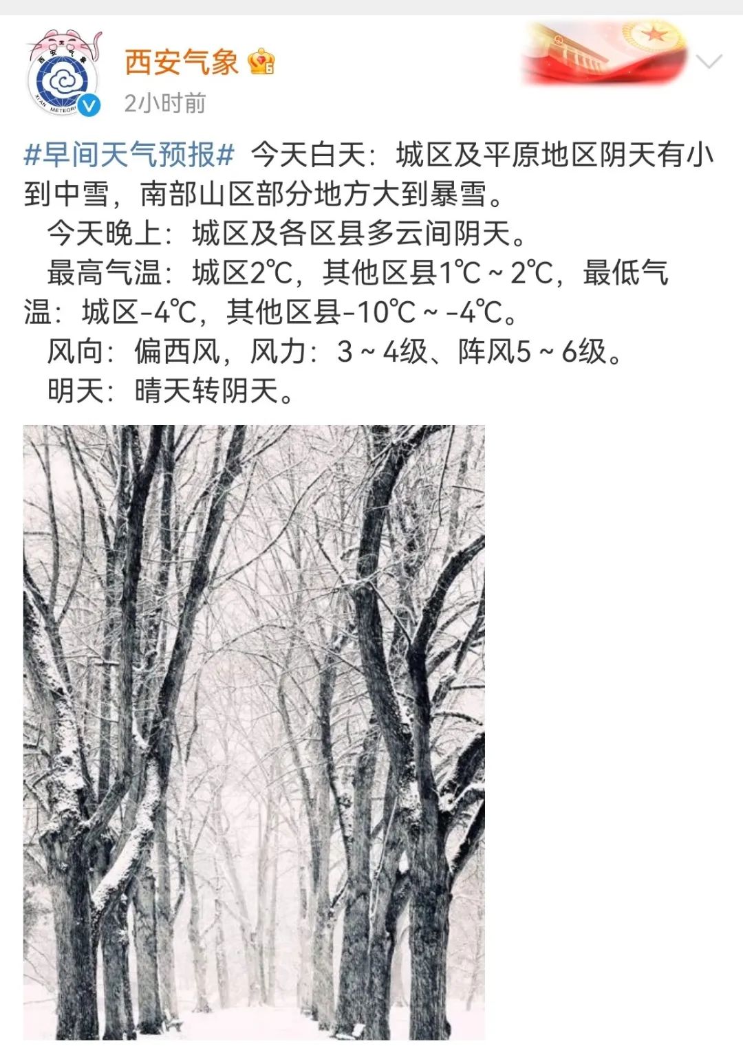 據(jù)陜西氣象最新預(yù)報(bào),今天白天:榆林、延安北部陰天轉(zhuǎn)多云,延安南部、關(guān)中北部有小雪,局地有中雪。陜南中西部有雨夾雪或小雪。關(guān)中南部、陜南東部有小到中雪,寶雞南部局地、西安南部局地、渭南南部局地、商洛北部局地、秦巴山區(qū)局地有大到暴雪。陜北西部、關(guān)中西部、陜南中西部、秦巴山區(qū)日平均氣溫下降 4-6℃。陜北有 4-5 級(jí)偏北風(fēng)。早上關(guān)中中西部、陜南西部、秦嶺山區(qū)有輕霧。