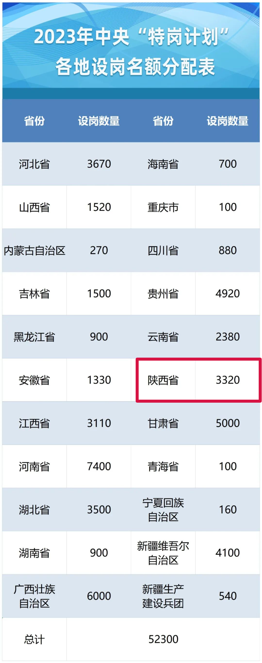 為深入貫徹黨的二十大精神,進一步落實《中共中央 國務院關于全面深化新時代教師隊伍建設改革的意見》,加強新時代教師隊伍建設,實現鞏固拓展脫貧攻堅成果同鄉(xiāng)村振興有效銜接,教育部、財政部近日聯合印發(fā)《關于做好2023年農村義務教育階段學校教師特設崗位計劃實施工作的通知》,全國計劃招聘特崗教師52300名,其中陜西招聘3320名。分配表如下→