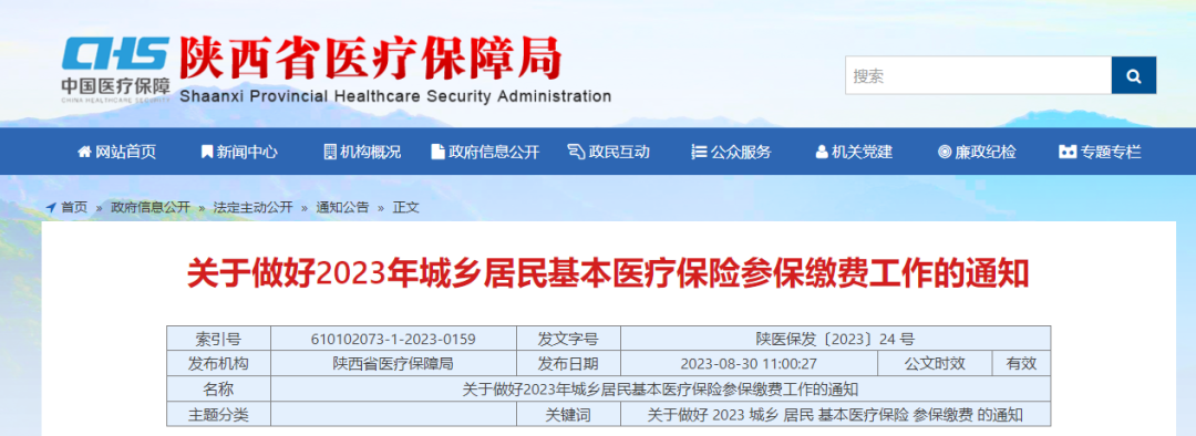 8月30日,陜西省醫(yī)療保障局網(wǎng)站發(fā)布了關(guān)于做好2023年城鄉(xiāng)居民基本醫(yī)療保險參保繳費工作的通知。