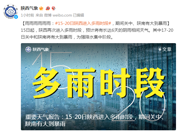 15-20日我省進(jìn)入多雨時(shí)段,17-20日關(guān)中、陜南有大到暴雨