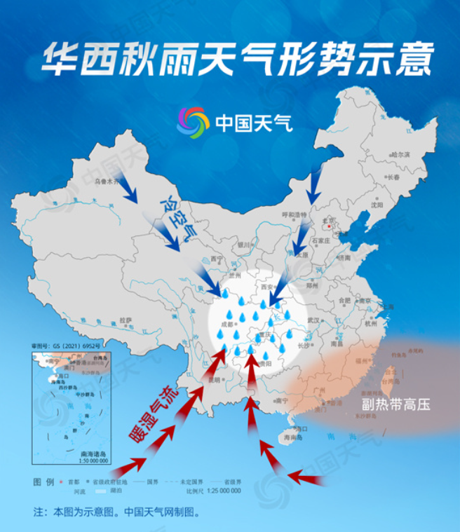 華西秋雨是我國(guó)華西地區(qū)秋季(9-11月)特有的天氣現(xiàn)象。秋季,頻繁南下的冷空氣與暖濕空氣在該地區(qū)相遇,使鋒面活動(dòng)加劇而產(chǎn)生較長(zhǎng)時(shí)間的陰雨天氣。主要影響區(qū)域?yàn)樗拇、重慶、貴州、寧夏南部、甘肅東部和南部、陜西南部及湖南西部、湖北西部等地。