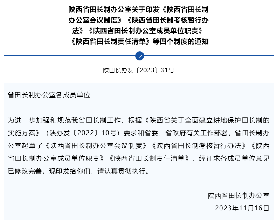 陜西省田長(zhǎng)制辦公室印發(fā)通知公布四個(gè)制度