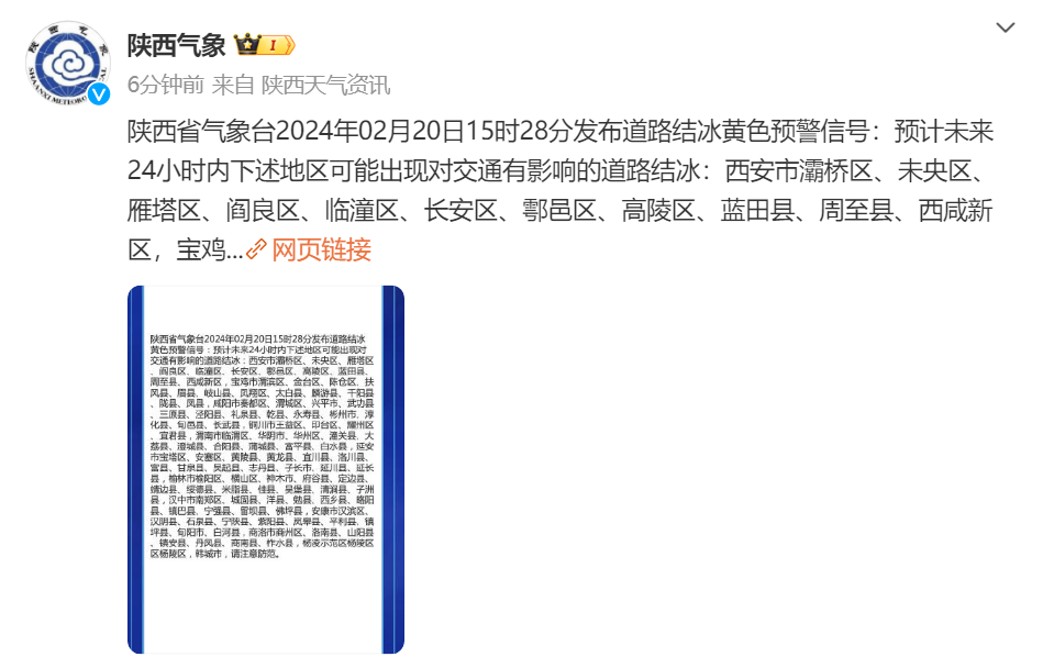陜西省氣象臺(tái)2024年02月20日15時(shí)28分發(fā)布道路結(jié)冰黃色預(yù)警信號(hào),預(yù)計(jì)未來(lái)24小時(shí)內(nèi)下述地區(qū)可能出現(xiàn)對(duì)交通有影響的道路結(jié)冰: