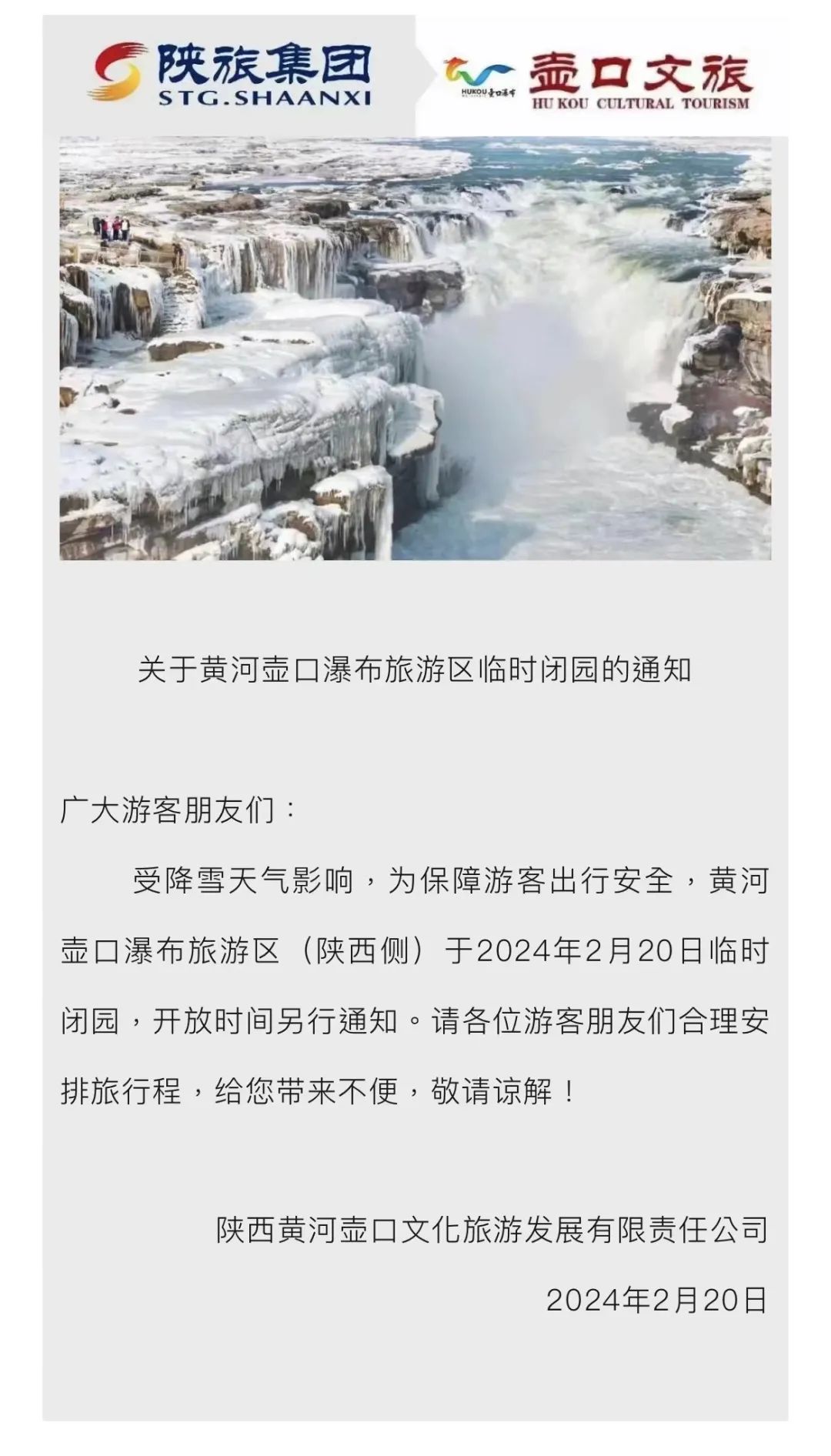 黃河壺口瀑布旅游區(qū)臨時(shí)閉園:受降雪天氣影響,為保障游客出行安全,黃河壺口瀑布旅游區(qū)(陜西側(cè))于2024年2月20日臨時(shí)閉園,開(kāi)放時(shí)間另行通知。請(qǐng)各位游客朋友們合理安排旅行程,給您帶來(lái)不便,敬請(qǐng)諒解!