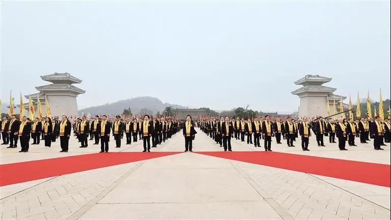 橋山巍峨,沮水流長。典前序禮上,序禮執(zhí)事宣誦《典前祝文》,來自全國部分省、自治區(qū)、直轄市,香港、澳門特別行政區(qū)和臺灣地區(qū)以及海外的參祭嘉賓,在儀仗隊的引領下,至誠至虔,一路景行軒轅橋、龍尾道,進軒轅廟山門。軒轅廣場上,象征中華民族大團結的56面龍旗迎風飄揚,參加公祭大典的各方代表在指定區(qū)域列隊肅立,現場氣氛莊嚴、肅穆。