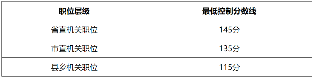 1.最低控制分數(shù)線。為確保錄用人員的基本素質(zhì),區(qū)別職位層級劃定進入面試資格復審人員的公共科目筆試總成績(不含公安專業(yè)考試成績)最低控制分數(shù)線,具體情況如下: