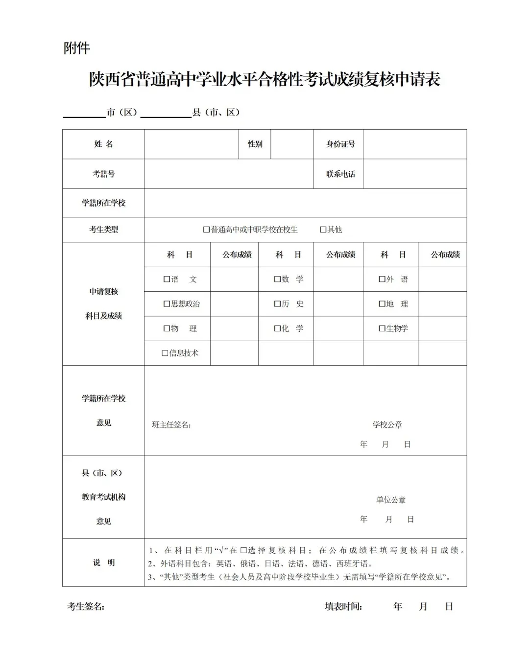 附件:陜西省普通高中學(xué)業(yè)水平合格性考試成績復(fù)核申請表