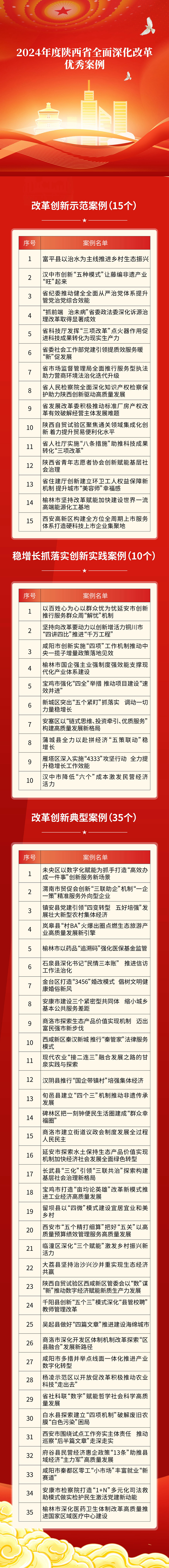 2024年度陜西省全面深化改革優(yōu)秀案例中,改革創(chuàng)新示范案例15個,包括富平縣以治水為主線推進鄉(xiāng)村生態(tài)振興等案例;穩(wěn)增長抓落實創(chuàng)新實踐案例10個,包括以百姓心為心以群眾憂為憂延安市創(chuàng)新推行服務群眾周“解憂”機制、堅持向改革要動力以創(chuàng)新增活力銅川市“四講四比”推進“千萬工程”、咸陽市創(chuàng)新實施“四項”工作機制推動中央一攬子增量政策落地見效等案例;改革創(chuàng)新典型案例35個,包括未央?yún)^(qū)以數(shù)字化賦能為抓手打造“高效辦成一件事”創(chuàng)新服務新場景、渭南市貿促會創(chuàng)新“三聯(lián)助企”機制“一企一策”精準服務外向型企業(yè)、鎮(zhèn)安縣黨建引領“四變轉型 五好培強”發(fā)展壯大新型農村集體經(jīng)濟等案例。