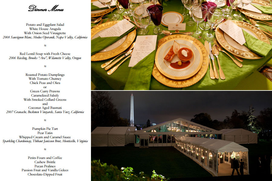 國(guó)宴的菜單是精心選定的,其中專門(mén)為素食主義者辛格準(zhǔn)備了鮮美素食。宴會(huì)菜譜主打印度和美國(guó)時(shí)令菜肴,頭道菜是土豆和茄子沙拉。甜點(diǎn)有南瓜餡餅、涂有生奶油和焦糖淋醬的梨撻,每道甜點(diǎn)都會(huì)配有不同口味的紅酒。