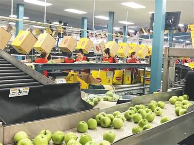 | 美國華盛頓州著名水果產(chǎn)地韋納奇的Auvi 果品公司包裝廠的自動生產(chǎn)線,對剛釆摘下來的青蘋果進(jìn)行清洗、質(zhì)量檢測、上蠟、包裝等一條龍加工流程,然后通過中國電商平臺天貓快遞到中國消費者手中。 |