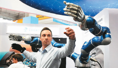 | 8月24日,北京亦創(chuàng)國(guó)際會(huì)展中心機(jī)器人大會(huì)上,一位德國(guó)的技術(shù)人員在展示機(jī)器人。 |