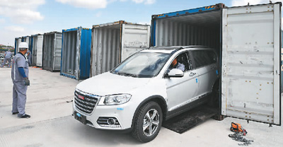 | 6月9日,在吉林省長(zhǎng)春國(guó)際陸港,工人將車輛裝入貨柜。 |