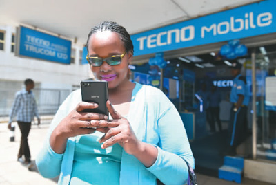 | 5月9日,在肯尼亞首都內(nèi)羅畢市中心,一名當(dāng)?shù)赜脩粽谑褂弥袊?guó)品牌手機(jī)。 |