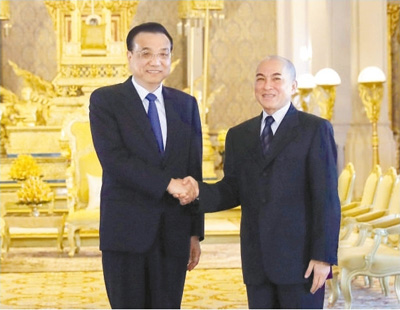國務(wù)院總理李克強當?shù)貢r間1月11日中午在金邊王宮會見柬埔寨國王西哈莫尼。