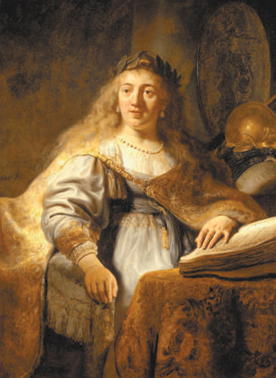 在《穿金邊斗篷的少女》這幅作品中,為了凸顯對明暗光影效果的處理能力,畫中人身著黑色斗篷,連同灰黑的背景,大面積的暗部將作為重點的人物面部烘托出來,宛若聚光式的映照,透過少女面部精致的五官,觀眾仿佛感受到了正款款流出的情思。在倫勃朗筆下,美不再僅僅是對漂亮容顏的寫真,光影之間,鮮活的人物個性塑造才是其孜孜以求的關鍵,成為最打動人心的地方,畫布里充滿被欣賞的氣氛。而他少有的歷史畫作,也無不彰顯其過人的天資。在《書房中的女神密涅瓦》中,老到而精煉的技法、逼真的物象處理、和諧的光影關系等,很難讓人相信這幅巨作出自年僅29歲的倫勃朗之手。