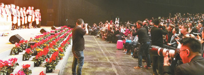 | “親情中華·歡聚巴塞羅那”演出結(jié)束后,演員謝幕,觀眾們?nèi)匀徊簧,臺上臺下齊唱《我的祖國》。本報記者 孫立極攝 |