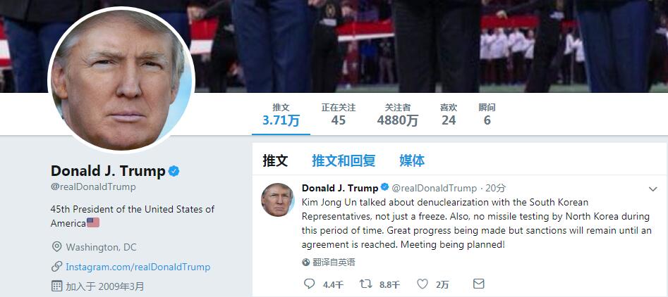特朗普隨后發(fā)推特說,朝鮮領(lǐng)導人金正恩向韓國特使團表達了無核化意愿,不只是凍結(jié)核試驗,并表示愿意停止導彈試驗,“開始計劃會晤”。