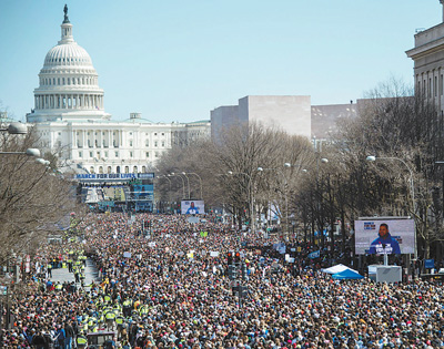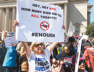 3月24日,來(lái)自全美各地的近50萬(wàn)人涌入美國(guó)首都華盛頓,參加以“為了我們的生命”為主題的反對(duì)槍支暴力大游行。游行者呼吁美國(guó)政府采取更加嚴(yán)格的控槍措施,保護(hù)校園安全,同時(shí)要求政客們不再接受美國(guó)全國(guó)步槍協(xié)會(huì)等團(tuán)體的政治獻(xiàn)金。這一天,從紐約、波士頓、洛杉磯,再到上月發(fā)生校園槍擊案的佛羅里達(dá)州帕克蘭,同一主題的大游行在全美390多個(gè)城市同步舉行。美國(guó)民眾尤其是青少年學(xué)生紛紛走上街頭,響亮地發(fā)出他們的聲音:“面對(duì)槍支暴力,我們不再沉默,政客們必須在控槍問(wèn)題上有所作為!