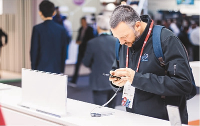 | 2月26日,2018年世界移動(dòng)通信大會(huì)在西班牙巴塞羅那會(huì)展中心開幕。圖為國外參會(huì)者在中國手機(jī)品牌小米的展臺(tái)前參觀體驗(yàn)。智 淵攝 |