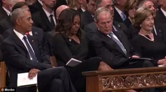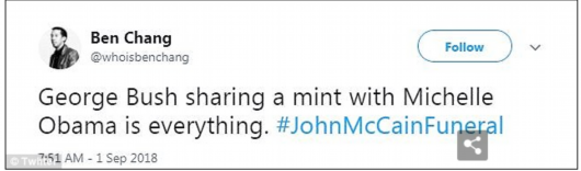 原標題:小布什在麥凱恩追悼會上給米歇爾傳糖 美國網(wǎng)友被暖到了