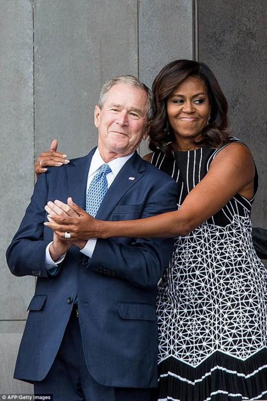 米歇爾在美國非裔美國歷史文化博物館的落成典禮上擁抱小布什