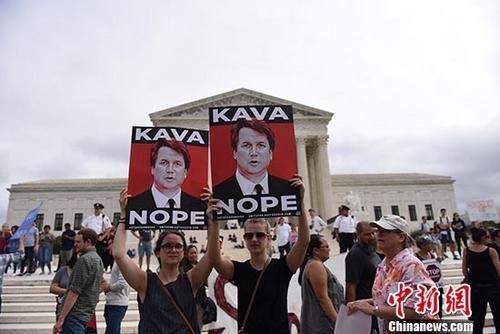 當?shù)貢r間10月6日,美國民眾在華盛頓的最高法院門前集會,反對卡瓦諾擔任最高法院大法官。當天,美國參議院最終投票確認卡瓦諾出任聯(lián)邦最高法院大法官。 中新社記者 鄧敏 攝