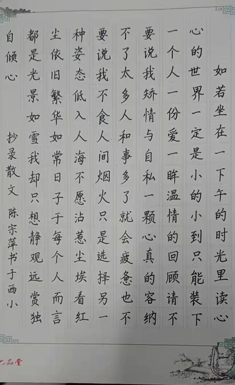 本次教師基本功大賽比賽內(nèi)容為“三筆一畫(huà)”,即硬筆字、粉筆字、毛筆字和簡(jiǎn)筆畫(huà)。其中硬筆書(shū)寫(xiě)內(nèi)容為教育方針,粉筆和毛筆書(shū)寫(xiě)內(nèi)容為古詩(shī)《靜夜思》,簡(jiǎn)筆畫(huà)內(nèi)容不限,自行創(chuàng)作。比賽現(xiàn)場(chǎng),老師們聚精會(huì)神地書(shū)寫(xiě),專(zhuān)心致志的繪畫(huà),墨香蕩漾著整個(gè)校園。鋼筆的一筆一畫(huà)中規(guī)中矩,結(jié)構(gòu)和諧,彰顯字如其人的道理;板書(shū)則美觀大方,橫豎撇捺折,筆鋒掠過(guò),一股明麗清新之氣撲人眉宇;簡(jiǎn)筆畫(huà)勾畫(huà)了了,像簡(jiǎn)明、得體、通俗的語(yǔ)言,傳達(dá)著富有感染力的情愫。