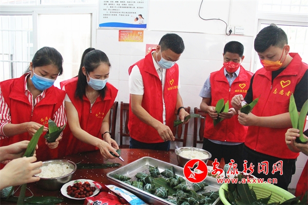 △ 構(gòu)朳鎮(zhèn)組織志愿者到敬老院給老人們包粽子
