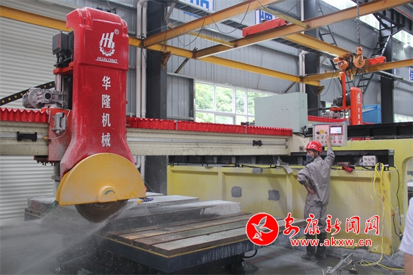 △ 賽樂石業(yè)生產(chǎn)車間內(nèi)工人正在操作機(jī)器切割石材