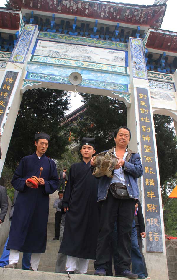 只有在每年的三月三、九月九日這兩天祖師殿舉辦廟會。附近和遠處的香客游人紛至沓來,敬神觀景,游山朝拜,休閑娛樂,已成為旅游的一處勝境。這種風俗已經沿襲了好幾個朝代。10月21日重陽節(jié),記者來到流水鎮(zhèn)祖師殿時,正巧碰上流水鎮(zhèn)水產站的單東林在兩名道士的陪同下進行放生,單東林手中捧著一只五、六十斤的一只大龜,據他介紹,這只龜是在集鎮(zhèn)上從一位漁民手中買的,已經是第二次買這個龜了,頭一次買了把它放進了湖里,沒想到,過了幾個月,他領著孫子在集鎮(zhèn)上逛,看見有個漁民在賣一只龜,他當時一眼就認出這就是他原來放生的那只。他掏錢把這只龜又買了下來。等到九月九日廟會這天,請祖師殿廟的道士進行放生。