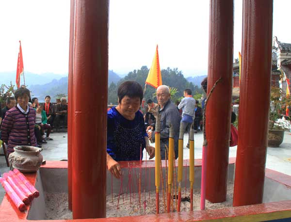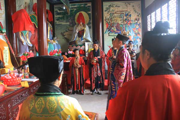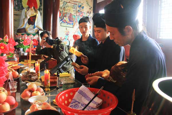 在祖師殿的正殿里,道長馬世富帶領幾名道士正在進行開光儀式。據悉,祖師殿最早建成時間已無從考證,但據碑文記載,清嘉慶十八年重修,文革期間遭嚴重毀壞。公元2000年經多方籌款,重修祖師殿,F分為上下兩殿和鐘樓等建筑宏偉,古色古香,精雕細琢,巧奪天工。