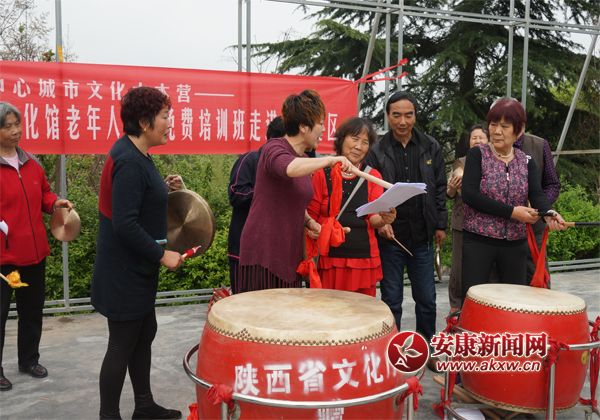漢濱區(qū)文化館老年人免費(fèi)鑼鼓培訓(xùn)班走進(jìn)張嶺社區(qū)