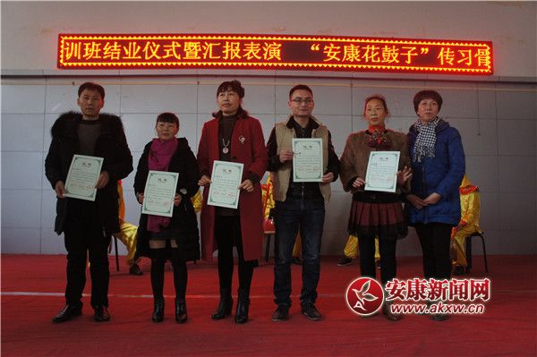 安康新聞網(wǎng)訊(通訊員 惠星 年靜) 12月2日,由安康市非遺保護(hù)中心、漢濱區(qū)文化館、區(qū)非遺保護(hù)中心共同舉辦的“把根留住•我眼中的非遺——安康花鼓子傳習(xí)骨干培訓(xùn)班結(jié)業(yè)儀式暨匯報(bào)表演”在安康市漢濱區(qū)文化館隆重舉行,首期參加培訓(xùn)的40名學(xué)員現(xiàn)場展示學(xué)習(xí)成果,并獲得結(jié)業(yè)證書。