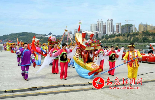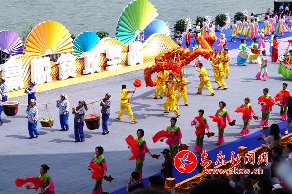 在龍頭祭祀儀式、龍舟競(jìng)技展示、“非遺”展演及民族歌舞表演等主題活動(dòng)之后,來自漢濱區(qū)的民間文藝社團(tuán)驚艷登場(chǎng),深受大眾喜愛的火龍、舞獅、彩龍等民俗節(jié)目伴隨著隊(duì)員們孔武有力的舞動(dòng)跳躍博得現(xiàn)場(chǎng)陣陣歡呼;喜慶熱烈的采船、花轎表演,俏皮滑稽的大頭娃娃、濟(jì)公,栩栩如生的西游記人物展演以及酒缸、花連棍、戲曲人物、民族舞展演等讓現(xiàn)場(chǎng)觀眾目不暇接,文藝隊(duì)員們?cè)谡寡葜写蠓女惒,點(diǎn)燃了現(xiàn)場(chǎng)觀眾的激情。