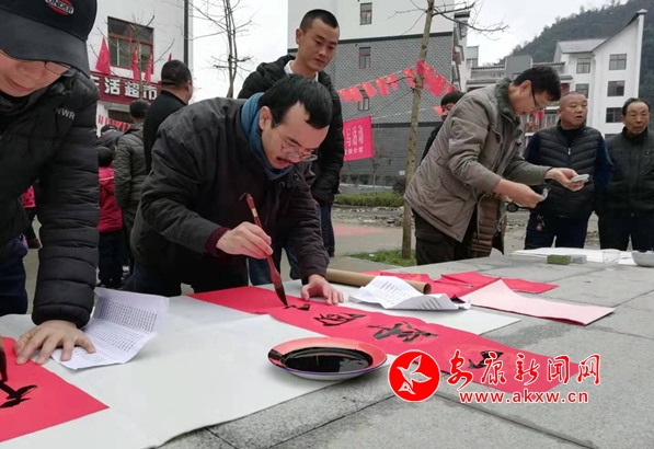 座談結(jié)束后,郭線廬一行在該鎮(zhèn)社區(qū)廣場開展了春聯(lián)義寫活動,F(xiàn)場創(chuàng)作書畫作品免費(fèi)贈予群眾,來自省、市、區(qū)的書畫家們飽含激情,現(xiàn)場揮毫潑墨,把一個個“福”字、一副副對聯(lián)、一張張精心創(chuàng)作的書畫作品送到群眾的手中,受到了周邊群眾的歡迎。