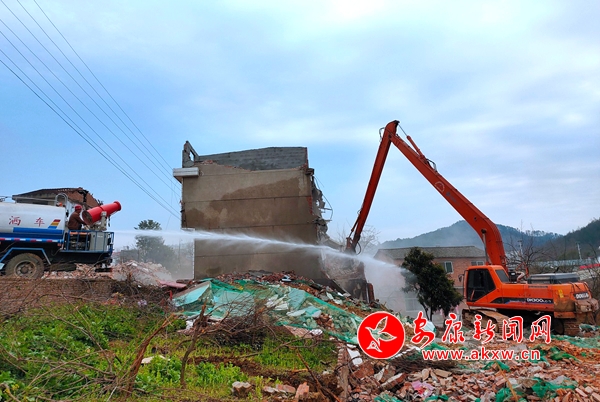 在木竹橋村五組房屋拆除現(xiàn)場,工作人員清場后,周圍拉起警戒線,挖機揮舞著長臂,灑水車噴灑除塵,工作人員分工配合,拆除現(xiàn)場井然有序,如火如荼。征收辦干部放棄休息時間,反復多次上門與拆遷戶商談,宣傳政策,簽訂協(xié)議,測量、核實面積,全力把受疫情影響的時間搶回來。