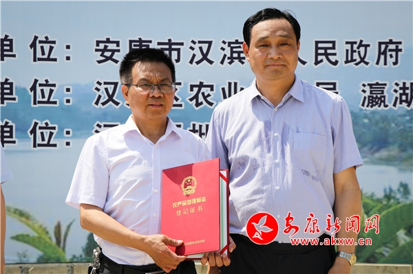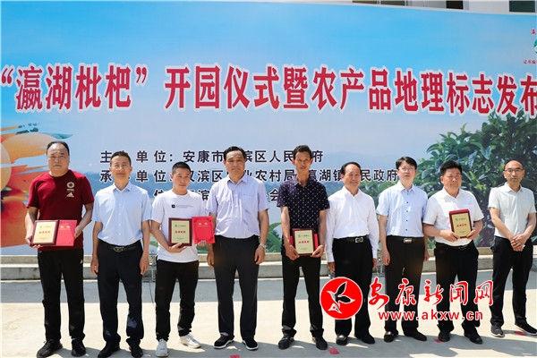 活動現(xiàn)場,陜西省農(nóng)產(chǎn)品質(zhì)量安全中心主任程曉東向漢濱區(qū)蠶茶果技術中心頒發(fā)了“瀛湖枇杷”農(nóng)產(chǎn)品地理標志證書。省市區(qū)領導向漢濱區(qū)農(nóng)興果業(yè)農(nóng)民專業(yè)合作社、漢濱區(qū)碧玉泉果業(yè)種植農(nóng)民專業(yè)合作社、安康天道酬勤農(nóng)業(yè)綜合開發(fā)有限公司、安康市康軒生態(tài)科技有限責任公司等首批“瀛湖枇杷”農(nóng)產(chǎn)品地理標志使用者頒發(fā)了準用證書并授牌。