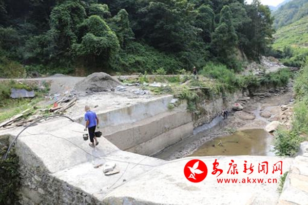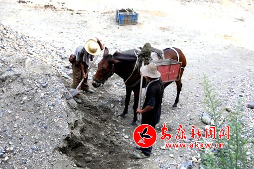 本網(wǎng)訊 (通訊員 唐紀(jì)創(chuàng))盛夏,在漢濱區(qū)流水鎮(zhèn)石家河岸邊,鳳凰農(nóng)民專業(yè)合作社的兩名工人忙著給騾子背上鐵框子裝砂石料,裝滿后,一名工人趕著兩頭騾子就上山了。